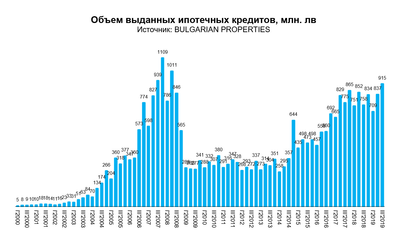 Объем вновь выданных ипотечных кредитов продолжает расти и достиг более 900 млн. лв в третьем квартале, что сопоставимо с показателями 2007/2008 гг. Но в настоящее время экономическая ситуация сильно отличается, ВВП значительно выше и как доля этого, вновь выданные ипотечные кредиты составляют до 3%, в то время как в 2007/2008 их объем превысил 6% от ВВП.