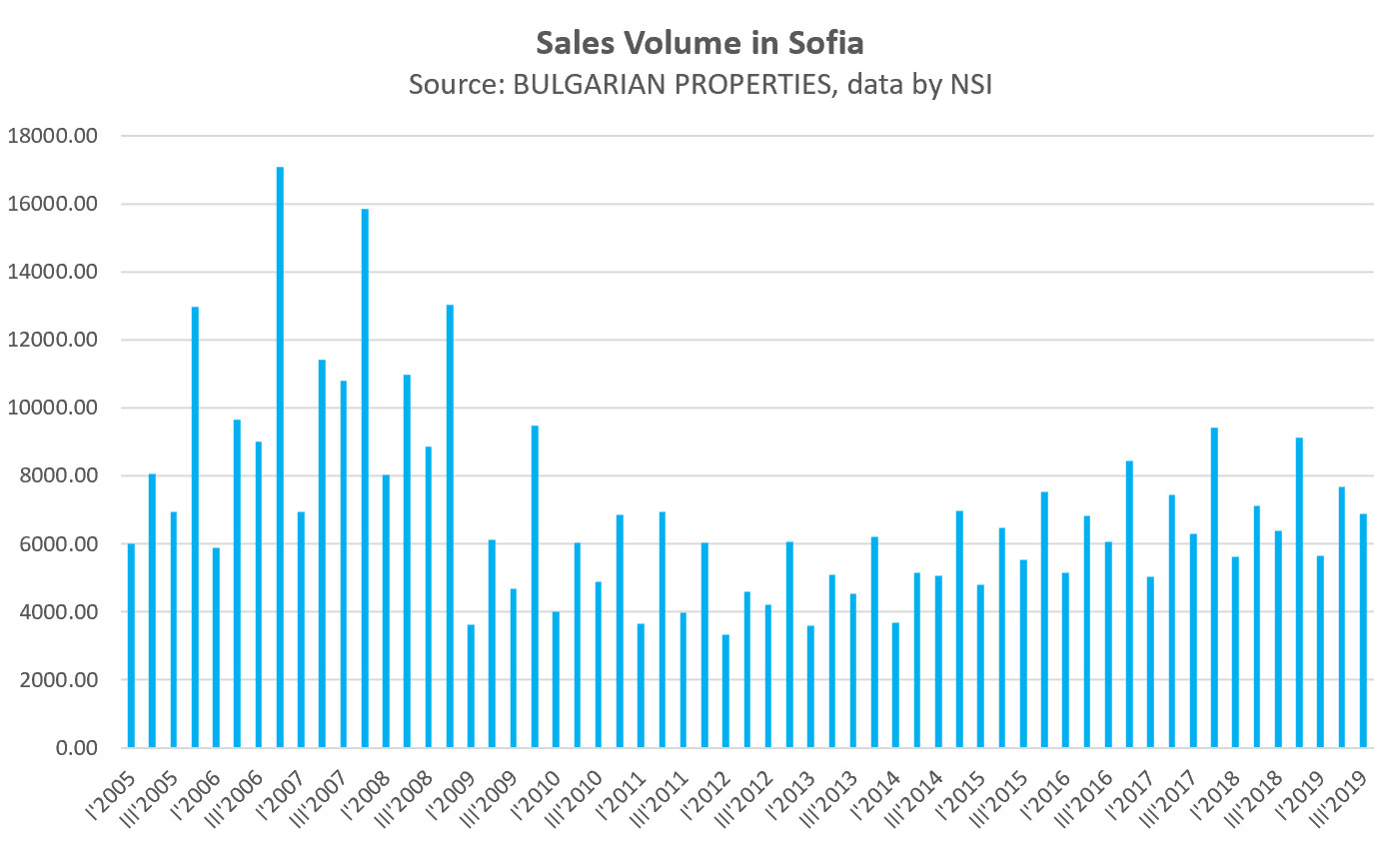 According to the Registry Agency, in the third quarter of 2019, 6,874 property sales were recorded in Sofia, compared to 6,376 for the same period in 2018, which is an increase of about 8% on an annual basis.