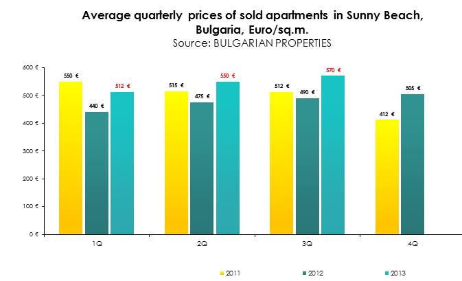 The average price of sold apartments in Sunny Beach for the third quarter of 2013, according to BULGARIAN PROPERTIES data, was 570 Euro/sq.m. compared to 490 Euro/sq.m. for the same period of 2012 and 550 Euro/sq.m. for the second quarter of 2013. The average price of the sold apartments was 33,700 Euro in 3Q 2013.