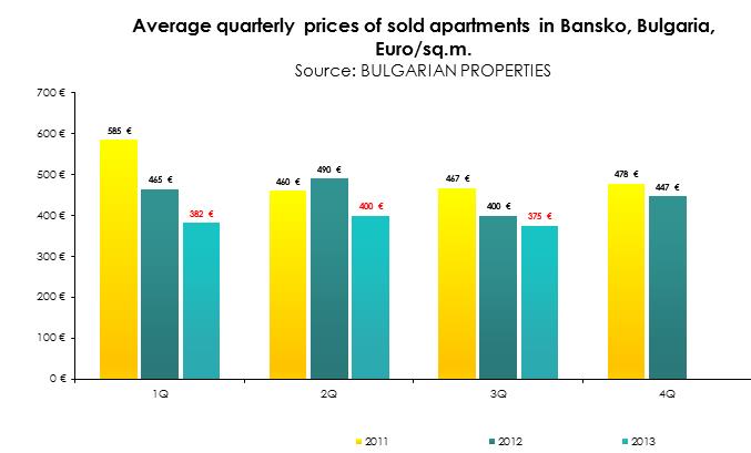 The average price of sold apartments in Bansko for the third quarter of 2013, according to BULGARIAN PROPERTIES data, was 375 Euro/sq.m., which represents a drop of -6% compared to the second quarter (400 Euro/sq.m.) and a fall of -6% year-on-year.