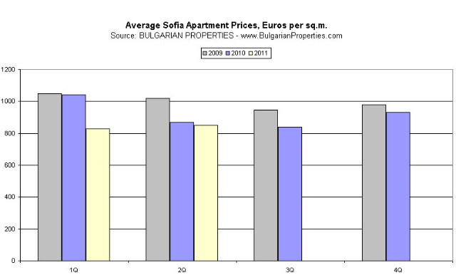 The average price of the deals concluded in Sofia in 2Q 2011 is 850 Euro as in the 1Q 2011 it was 830 Euro (a small increase of 2.5%), while compared to the same quarter of 2010 there is a decrease of about 5% (from 870 EUR/sq.m.). In the last year property prices in Sofia are between 830-870 EUR/sq.m. (except for the last quarter of 2010 when they were 930 EUR/sq.m. due to the more deals in the higher price segment) so in general the market hasn’t changed much in the last year.