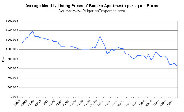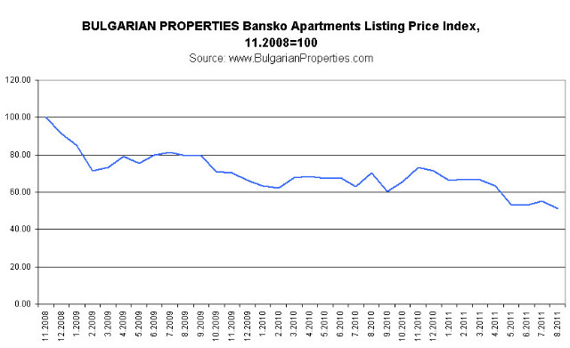 With index value for Bansko of 100 in November 2008 in August 2011 it is already 51.31 which shows an almost 50% decrease in the listing prices compared to their highest value in 2008. The drop in Bansko property prices based on actually concluded deals is similar – 53%.