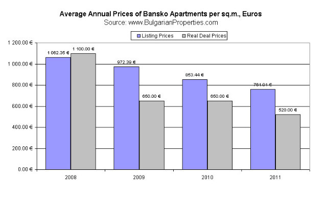 After the 2010/2011 winter season, which was not so dynamic for property deals, in May 2011 listing prices of apartments for sale in Bansko dropped by about 10% compared to the previous months. After the ending of the season listing prices of offered apartments underwent some changes which led to an increased interest in ski resorts in the summer months and to more deals than during the ski season.