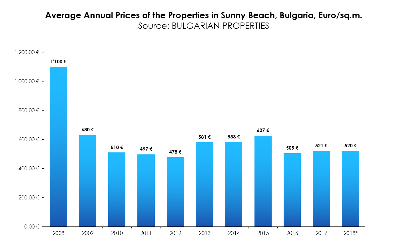 In summary, we can say that, based on the data BULGARIAN PROPERTIES has been collecting over the last 10 years, it is obvious that even during the global crisis from 2008 prices in Sunny Beach didn’t fall below 480-490 Euro/sq.m. Presently, they are close to these historically lowest levels, and this is inevitably attracting interest.