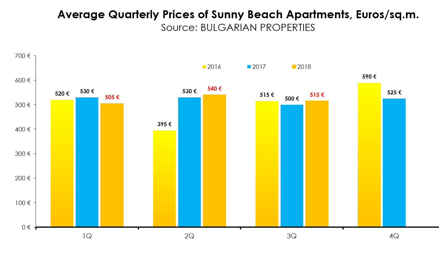 The average price in Sunny Beach in Q3 of 2018 according to BULGARIAN PROPERTIES was 515 Euro/sq.m. compared to 500 Euro/sq.m. during the same period in 2017. Overall, the average price remains unchanged in the last 2 years and this shows that the market is stable and balanced.