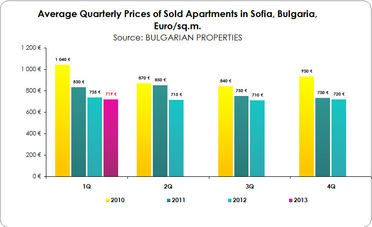 The average price of apartments sold in the first quarter of 2013 was 719 EUR/sq.m. In 1Q of 2012 it was 735 EUR/sq.m. (2.2% decrease year-on-year), according to BULGARIAN PROPERTIES’ data. The prices are unchanged compared to 4Q of 2012 when the average price of sold apartments was 720 EUR/sq.m.
