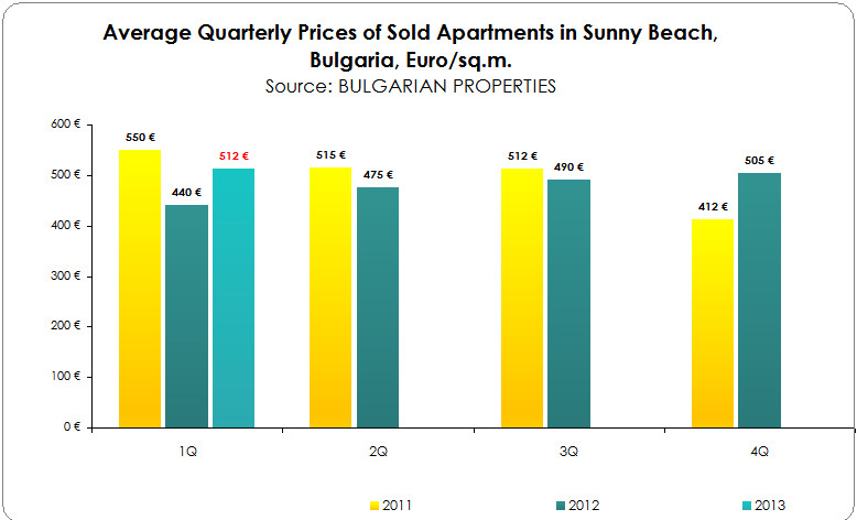 The average price of apartments sold in Sunny Beach in the first quarter of 2013 according to BULGARIAN PROPERTIES’s data was 512 EUR/sq.m., while in 1Q 2012 it was 440 EUR/sq.m. and in 4Q 2012 it was 505 EUR/sq.m. According to the concluded deals statistics of our company, it appears that the market bottom in Sunny Beach was in the first quarter of 2012 and since then the average prices have increased reaching the levels from the second half of 2011.