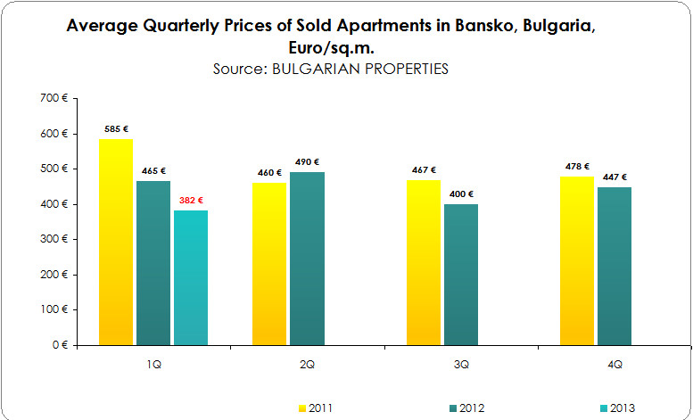 The average price of apartments sold in Bansko in the first quarter of 2013 was 382 EUR/sq.m., which is almost the minimum value of the asking prices. This clearly shows that the buyers prefer the cheapest properties on the market.