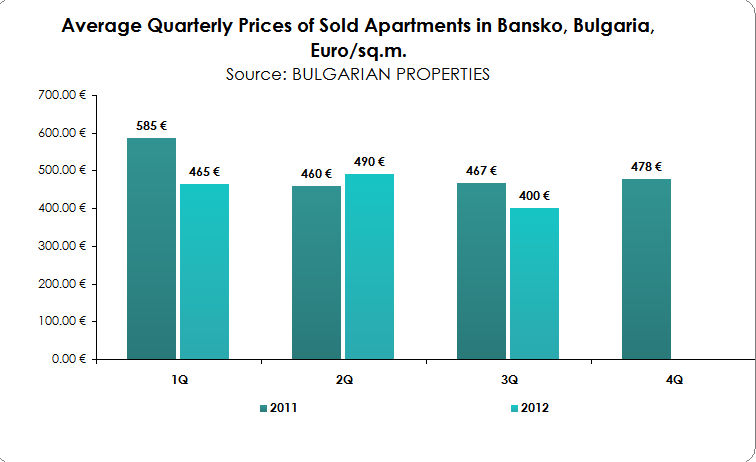 Bansko is definately the leader in low prices - at the moment it is the cheapest holiday market in Bulgaria and throughout Europe. Prices start from 300 EUR/sq.m. and the cheapest sold apartment in the third quarter was a fully furnished studio with an area of 30 sq.m for 11,800 Euro.