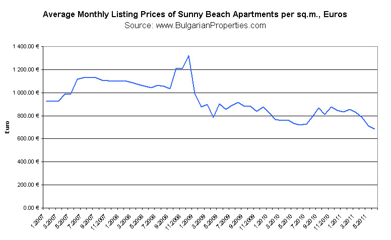 BULGARIAN PROPERTIES’ index of the listing prices of apartments in Bulgaria’s biggest seaside resort – Sunny Beach – shows that at present prices of holiday apartments there are 50% lower compared to their peak values in 2008.