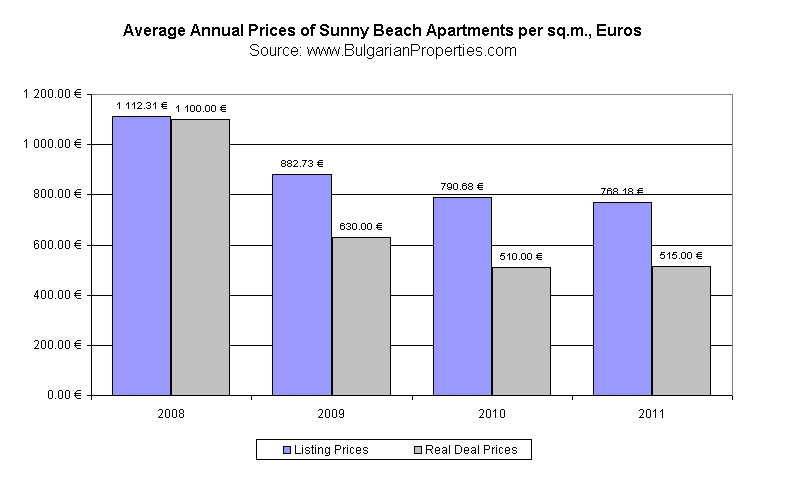 BULGARIAN PROPERTIES’ index of the listing prices of apartments in Bulgaria’s biggest seaside resort – Sunny Beach – shows that at present prices of holiday apartments there are 50% lower compared to their peak values in 2008.