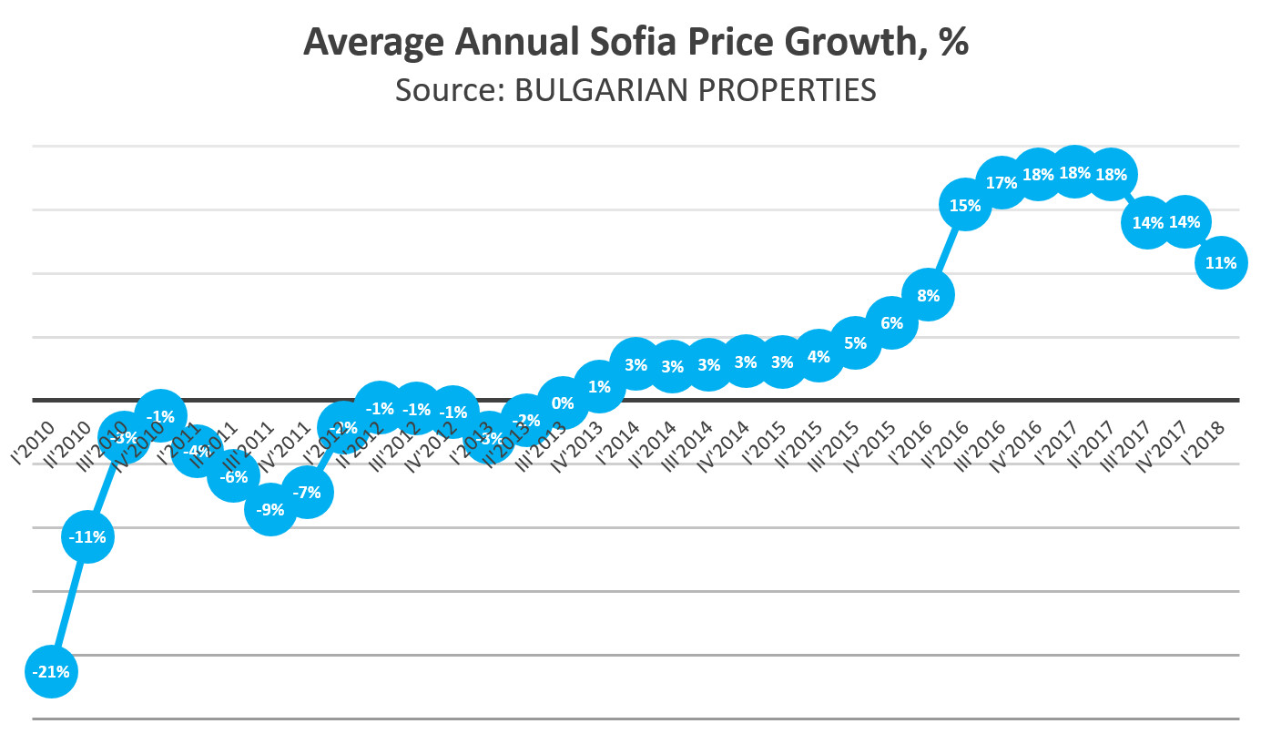 BULGARIAN PROPERTIES data show that Q1 of 2018 prices in Sofia remained on the levels reached at the end of last year, and their annual growth has slowed down.