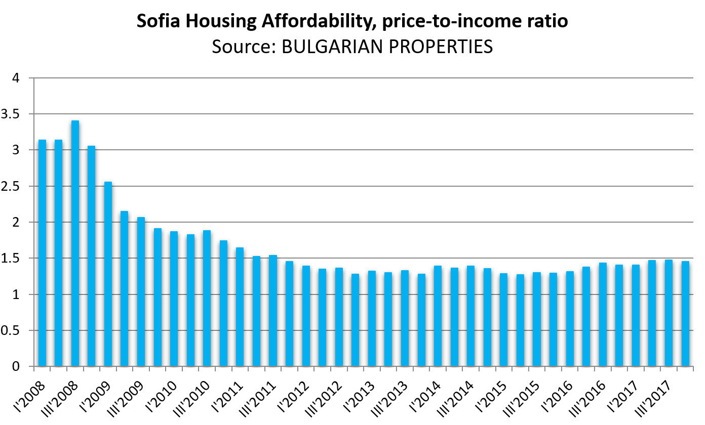 The price affordability index in Sofia (ratio of the price of dwellings per sq.m to the average salary in the capital) is 1.45 at the end of 2017 and is considered to be within good levels. There is a slight improvement compared to Q3 of 2017, when the indicator was 1.48. This is beacause with the increase of the property prices, the salaries in Sofia also increased (with 10.4% in 2017 according to NSI data). The ratio remains relatively stable and far from the values from the previous boom when it reached nearly 3.5.
