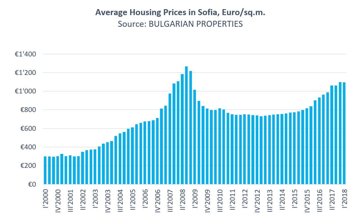 The average property price in Sofia for this period was 1,092 Euro/sq.m. compared to 1,095 Euro/sq.m. at the end of 2017. It seems that after the speedy passing of the 900 and 1,000 Euro/sq.m. borders, prices have become more uncertain in passing the next barrier of 1,100 Euro.