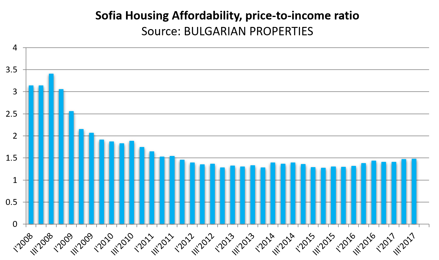 The price affordability index in Sofia (the ratio of the price per sq.m to the average salary in the capital) remains at around 1.48. There is a slight drop in the affordability of properties in the capital, but the overall rate is at levels from mid-2011 to early 2012 and is well below its previous bump when it reached nearly 3.5.