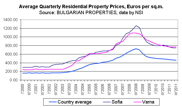 The latest data for apartment prices in the regional cities in Bulgaria, announced by the National Statistical Institute (NSI), shows that property prices continue to fall in the 3Q 2011, but that the drop is slowing down compared to previous periods.