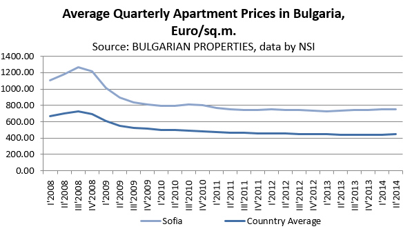The average price of sold apartments in the regional cities in Bulgaria in Q2 2014 was 444 EUR/sq.m (compared to 443 EUR/sq.m in Q1 2014).