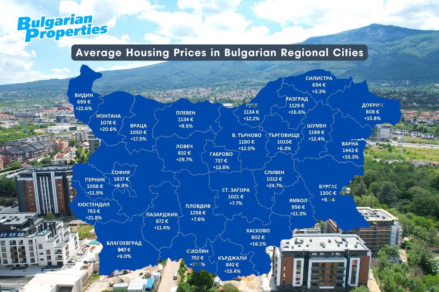 1,837 euro/sq.m. is the average price for residential properties in Sofia, according to the statistics of BULGARIAN PROPERTIES. Varna with 1,443 euro/sq.m., Burgas with 1,300 euro/sq.m. and Plovdiv with 1,259 euro/sq.m. follow in the ranking of the most expensive properties. The cheapest are the homes in Silistra - 694 euro/sq.m.