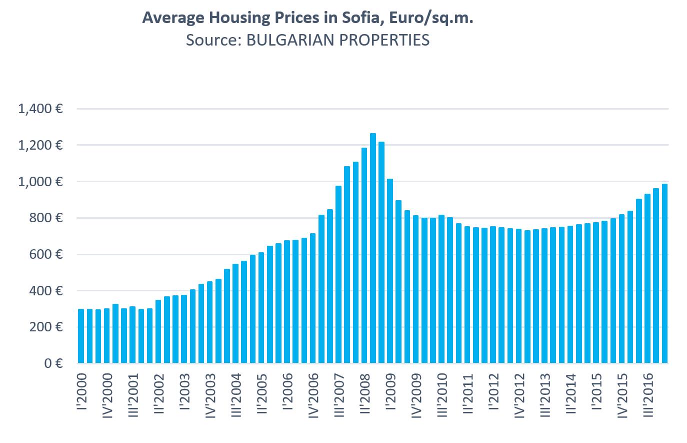 At present, property prices in Sofia are at levels similar to those from the end of 2007. The peak values in the third quarter of 2008 have not yet been reached in the pre-crisis boom when the average house price in Sofia reached 1260 Euro/sq.m.