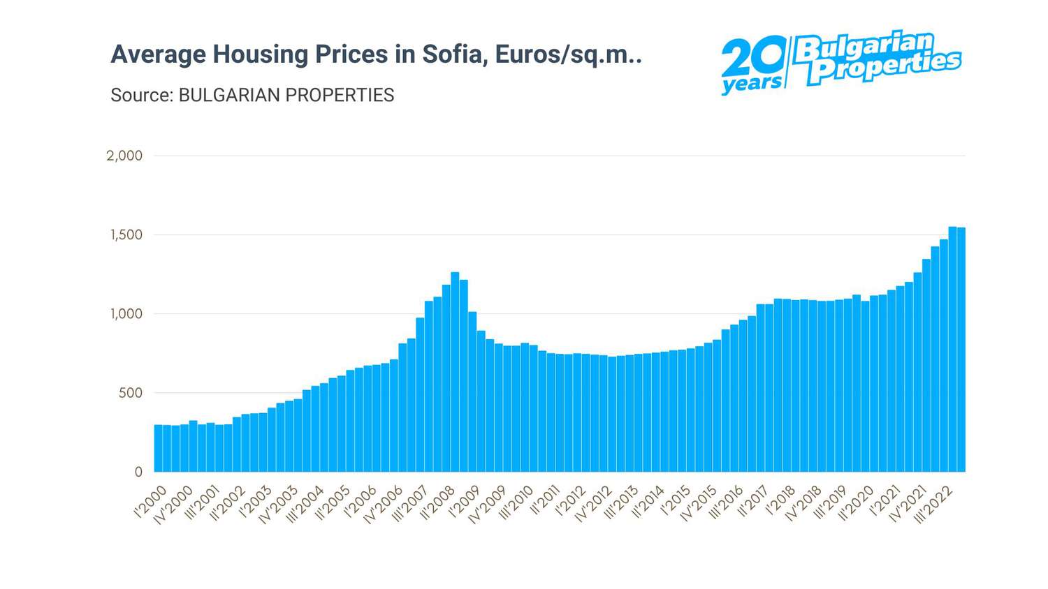 The average price of properties purchased in Sofia during the first quarter of 2023, according to BULGARIAN PROPERTIES, was 1,545 Ђ/sq.m., compared to 1,345 Ђ/sq.m. during the first quarter of 2022 and 1,550 Ђ/sq.m. at the end of 2022. This represents a nearly 15% year-on-year increase and a flat quarter-on-quarter level.