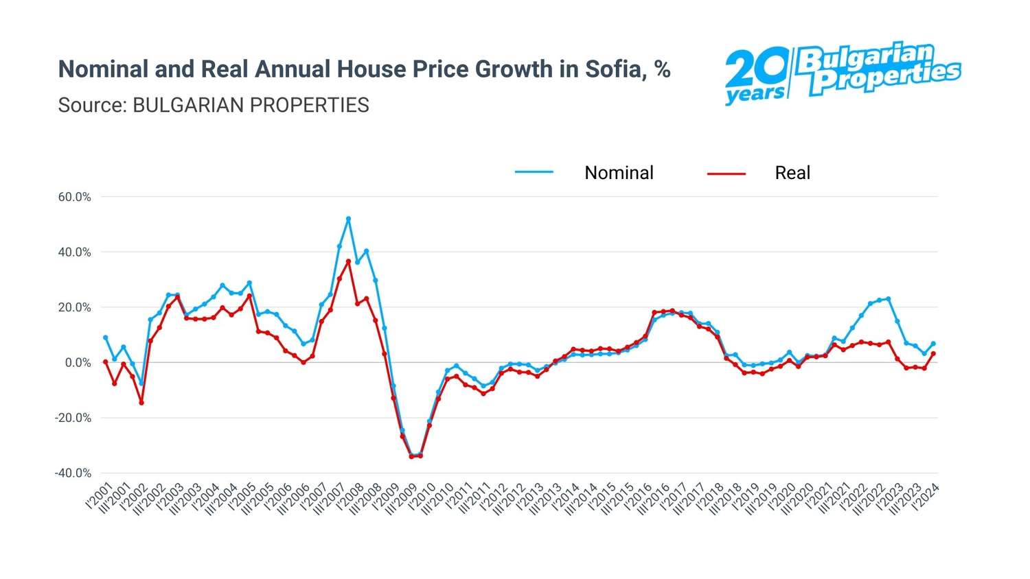 According to BULGARIAN PROPERTIES, the average price of homes purchased in the first quarter of 2024 in Sofia is EUR 1,650/sq.m., compared to EUR 1,545/sq.m. at the beginning of 2023. Thus, annual price growth in the Bulgarian capital accelerates nominally to 6.8% after a slowdown in late 2023.