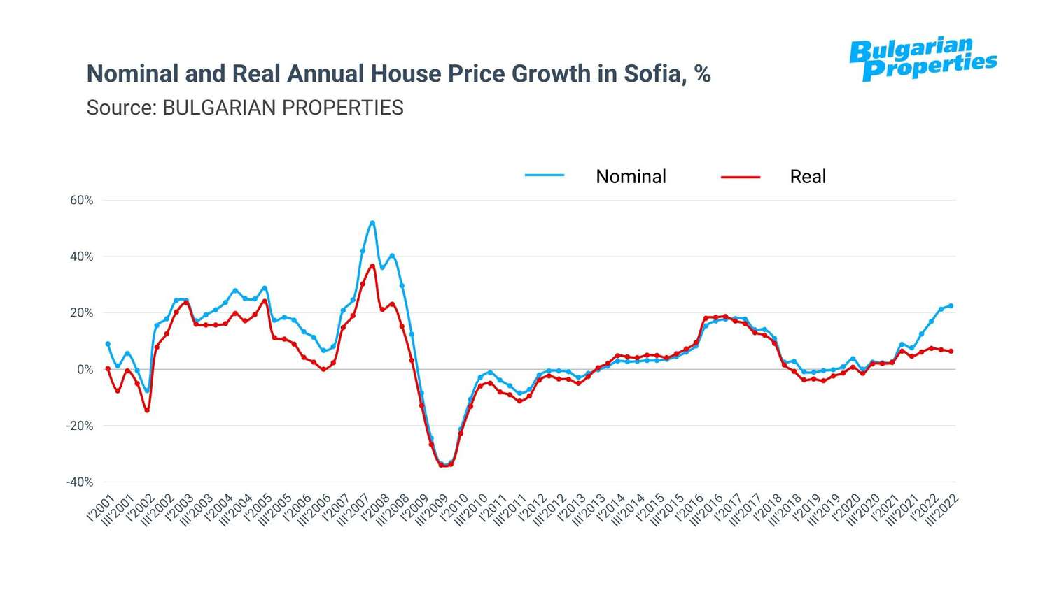 In 2022 the housing market in Bulgaria became red hot, experiencing price growths which we hadn't seen in over a decade. This is a direct consequence from the high inflation, which has caused house prices to accelerate their growth rate from 8-10% in 2021 to over 20% in 2022.