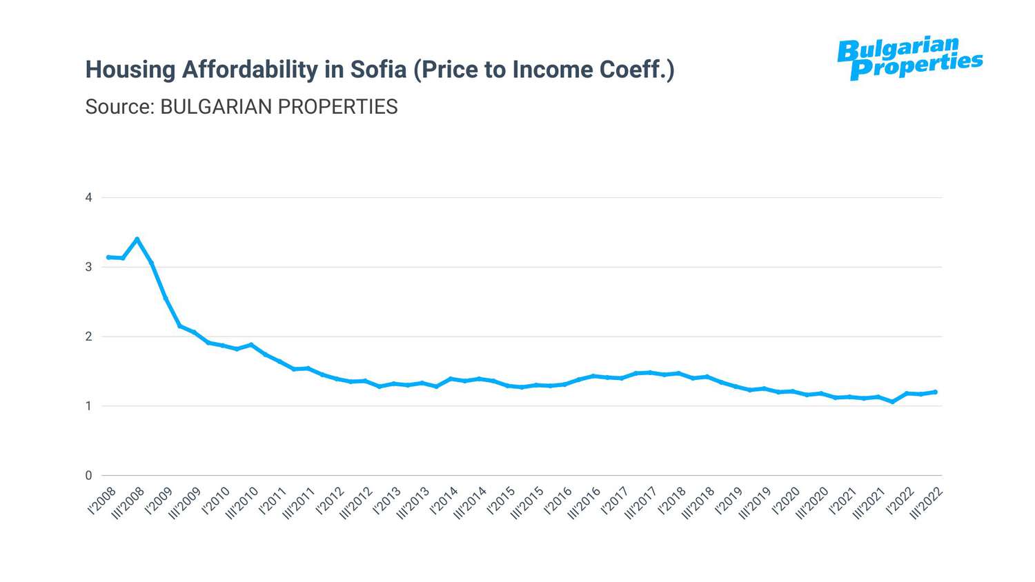 It increased and returned to the levels from the beginning of 2020, showing a small decline in housing affordability. Currently, the purchase of 1 sq.m. apartment in Sofia requires about 1.2 average monthly Sofia salaries. For comparison, in the previous peak of the market in 2008, 3.4 monthly salaries were needed to buy the same area.