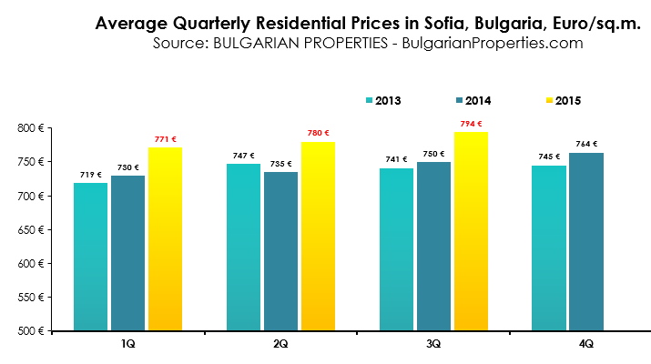 According to data collected by BULGARIAN PROPERTIES the average price of the sold apartments in Sofia in Q3 of 2015 is 794 Euro/sq.m. compared to 780 Euro/sq.m. for Q2 of 2015 and 750 Euro/sq.m. for Q3 of 2014. Accordingly, the increase in property prices in Sofia amounted to 6% on a yearly basis and 1.8% on a quarterly basis.