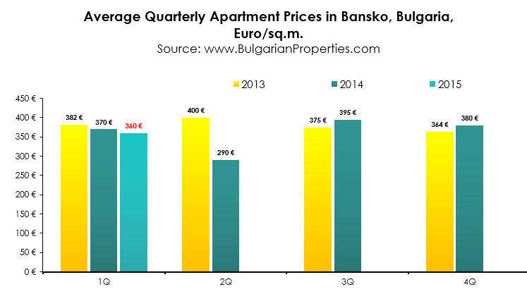 The average price of sold apartments in Bansko for Q1 of 2015 is 360 Ђ/sq.m. – the same as the average price for the whole 2014, so we can say that currently the prices in Bansko are stable. The average overall purchase price of apartments in the resort was a little higher than its level from last year – 24,000 Ђ (compared to 20,100 Ђ in 2014).