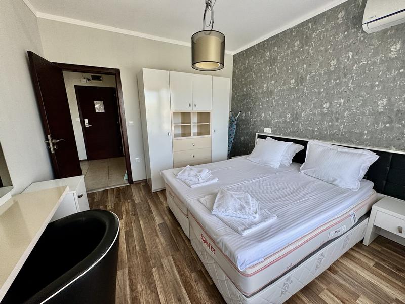Меблированная трехкомнатная квартира на первой линии в Приморско г. Приморско Квартира с двумя спальнями в закрытом комплексе с множеством удобств Представляем вашему вниманию трехкомнатную квартиру в закрытом комплексе, расположенном на первой линии в центральной части Приморско, прямо напротив Южного пляжа и всего в 2 минутах ходьбы от центральной площади и всех удобств, которые предлагает курортный город. Небольшое