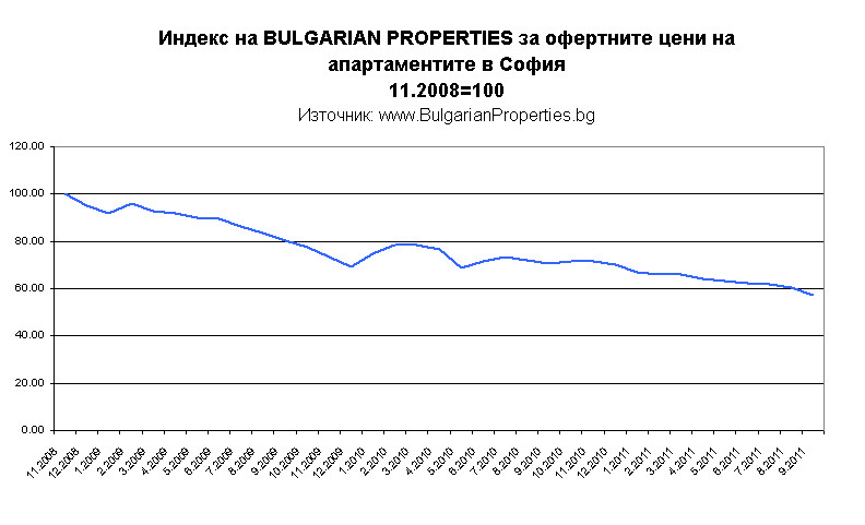 На база офертни цени на апартаментите в София индексът на BULGARIAN PROPERTIES при база 11.2008 г. = 100 през месец септември 2011 има стойност 57.32, т.е. офертните цени в столицата са спаднали с над 40% от пиковите им стойности преди кризата. Същото важи и на база реално сключени сделки – цените в София са спаднали от 1340 евро на кв.м. през 2008 г. до 810 евро на кв.м. за първите 9 месеца на 2011 г., което прави натрупан спад на цените в София от началото на кризата от 39.5 %.