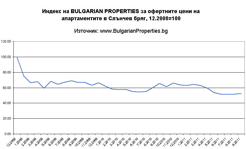 Индексът на BULGARIAN PROPERTIES за офертните цени на апартаментите в най-големия морски курорт в България - Слънчев бряг към 9.2011 г. е със стойност 52.39 при база 12.2008 г. = 100. В рамките на изминалите месеци цените на оферираните за продажба апартаменти в Слънчев бряг не са се променили. Натрупаният спад в цените на този тип имоти от пиковите им стойности през 2008 г. е около 50%. Приблизително същият е спадът в цените, измерен на база реално сключени сделки – 54%.