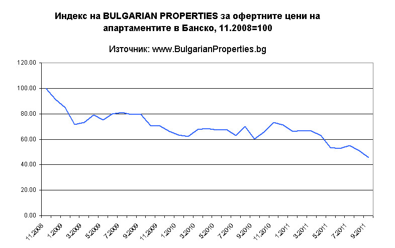 Индексът на BULGARIAN PROPERTIES за офертните цени на апартаментите в Банско за септември 2011 г. е със стойност 45.64 при база 11.2008 = 100. Това показва, че цените на оферираните апартаменти за продажба са спаднали с близо 55% от най-високите си стойности през 2008 г. Толкова е и натрупаният спад на база реално сключени сделки – от 1100 евро на кв.м. през 2008 г. до 505 евро на кв.м. през 2011 г.
