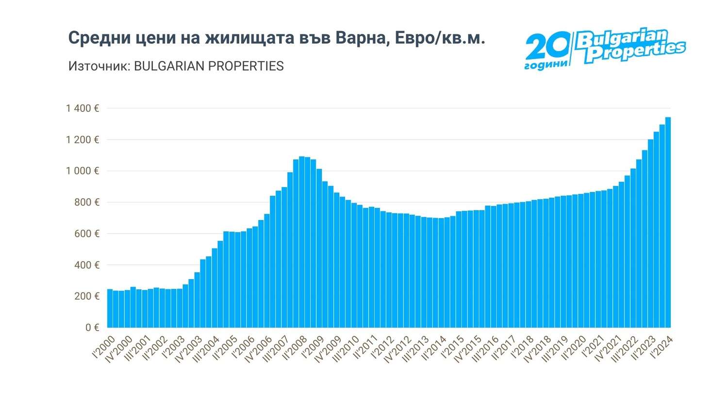 През първото тримесечие на 2024 г. средната цена на жилищата във Варна достигна 1 343 евро на кв.м., а годишният растеж е един от най-големите в страната – 18.5%.