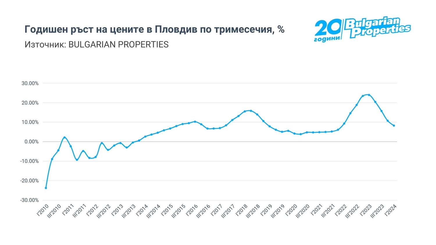 Пловдив следва плътно тенденциите на жилищния пазар в София и ги прихваща по-бързо от останалите градове. Видно е как ускоряването на растежа и забавянето му се случват по-рано от тези във Варна и Бургас. Данните за първото тримесечие сочат, че ръстът се е забавил до около 8% на годишна база.