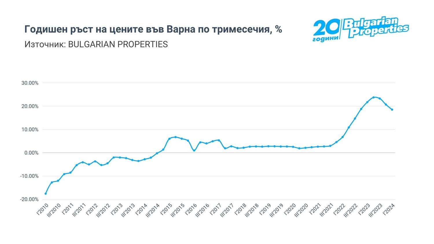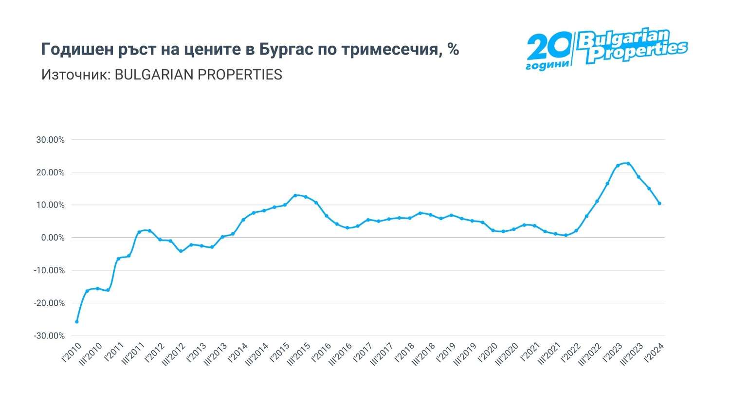 Най-бързо продължават да нарастват цените във Варна, където ръстовете се ускориха едва след средата на 2022 г. и към момента остават на нива близо до 20%, докато в Пловдив и Бургас отчитаме годишно нарастване от около 8-10%.