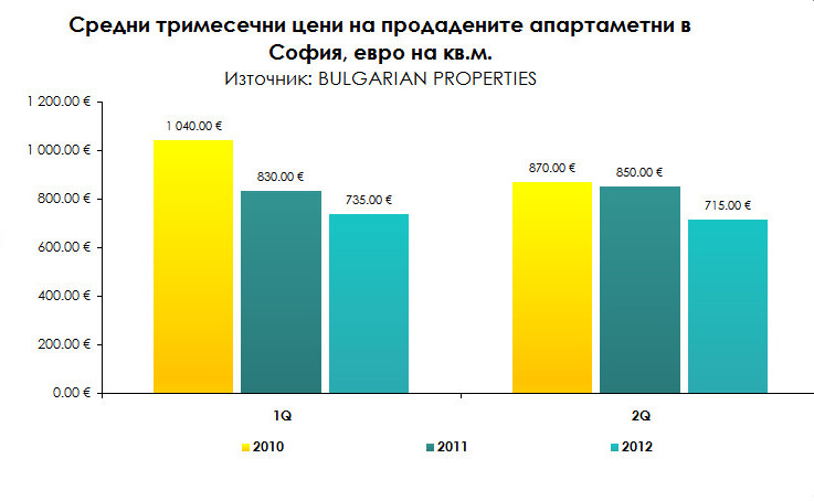 Средната офертна цена по данни на BULGARIAN PROPERTIES е 900 евро на кв.м., а цената на продадените апартаменти през второто тримесечие е 715 евро на кв.м. Наблюдава се тенденция на слабо покачване на средните цени на оферираните за продажба апартаменти в столицата, докато средните цени на продадените апартаменти спадат с 2.7% спрямо предходното тримесечие (735 евро на кв.м. за първо тримесечие на 2012 г.).