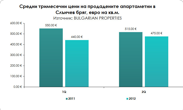Средната офертна цена на апартаментите в Слънчев бряг за второто тримесечие по данни на BULGARIAN PROPERTIES е 740 евро на кв.м., а сделки се сключват на средна цена 475 евро на кв.м. (при 440 евро на кв.м. през първото тримесечие на 2012 г.) През последните месеци пазарът в Слънчев бряг бележи положителна ценова тенденция на база офертни и продажни цени, което е индикация за започнало възстановяване, но все пак цените все още са на нива под миналогодишните си стойности.