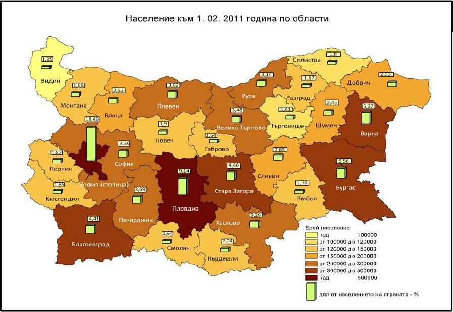 Експресните данни на НСИ сочат, че 73% от населението в България живее в градовете, а 27% - в селата. През последните 10 години населението на България бележи спад с малко над 580 000 души или около -7%. Именно в областните градове се сключват между 55 и 60% от общия брой продажби на недвижими имоти в България през последните години по данни на Агенцията по вписванията, изведени от BULGARIAN PROPERTIES.