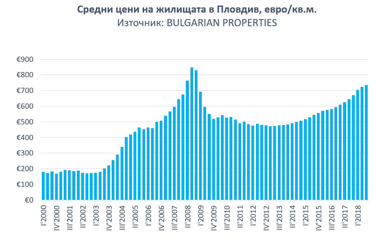 Средната цена в Пловдив за третото тримесечие по данни на BULGARIAN PROPERTIES е 735 евро/кв.м., като цените се движат между 650 евро и 800 евро на кв.м. в зависимост от района.