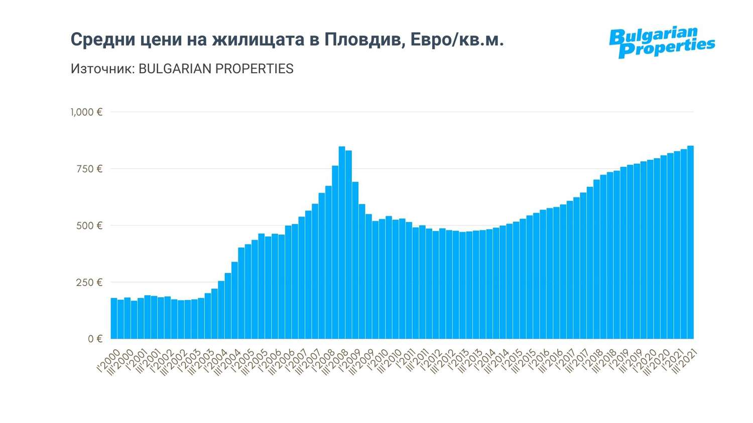 Средната цена на жилищата в Пловдив през 3-тото тримесечие по данни на BULGARIAN PROPERTIES е 850 евро/кв.м. при 808 евро/кв.м. година по-рано.