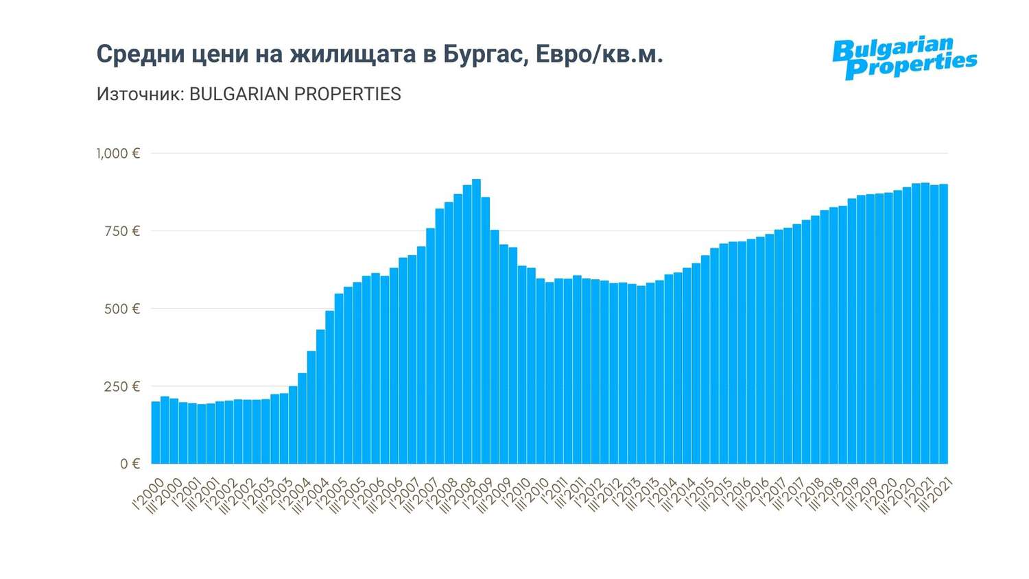 Това представлява годишен ръст от 5.2%, сходен с този от преди пандемията. Цените в Пловдив вече достигнаха нивата от 2008 г., но все още са по-ниски от тези във Варна и Бургас.