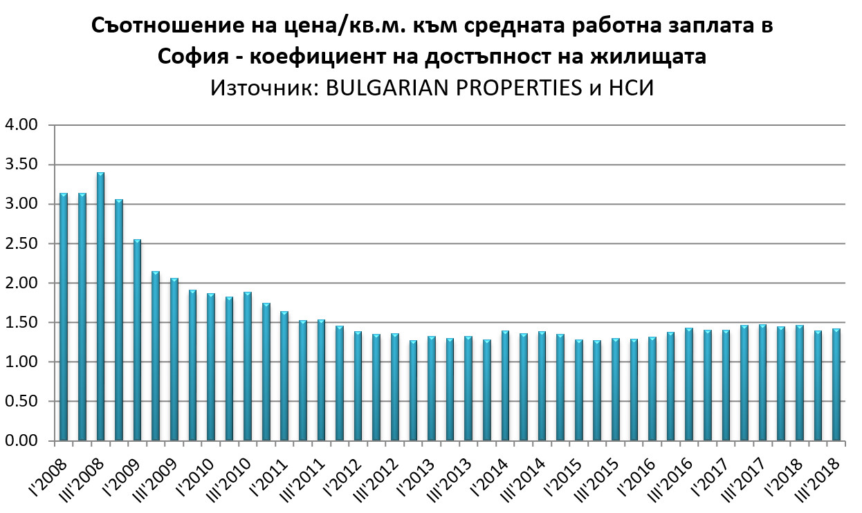 Показателят за достъпност на цените в София (съотношение на цената жилищата на кв.м. към средната заплата в столицата) е на ниво 1.42 за третото тримесечие, което е леко намаление спрямо достигнатите нива 1.45-1.47 в предните тримесечия. Това значи, че към момента имотите в София са една идея по-достъпни в сравнение с 2017 г. и началото на тази година.