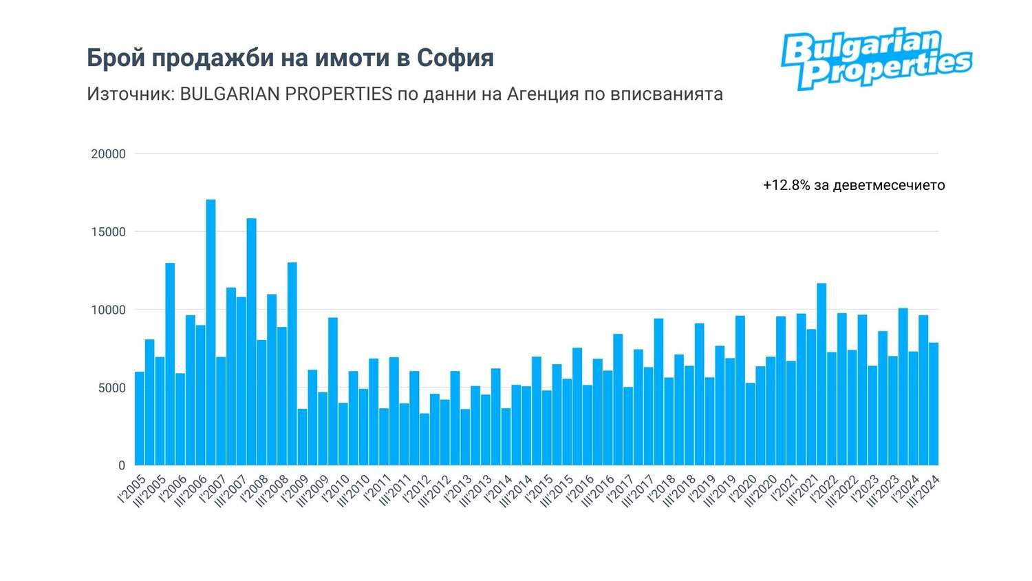 Изчисленията на BULGARIAN PROPERTIES по данните на Агенцията по вписванията показват, че сделките с имоти в София бележат ръст от близо 13% за деветмесечието. За първите девет месеца на годината в София са вписани 24 818 сделки.