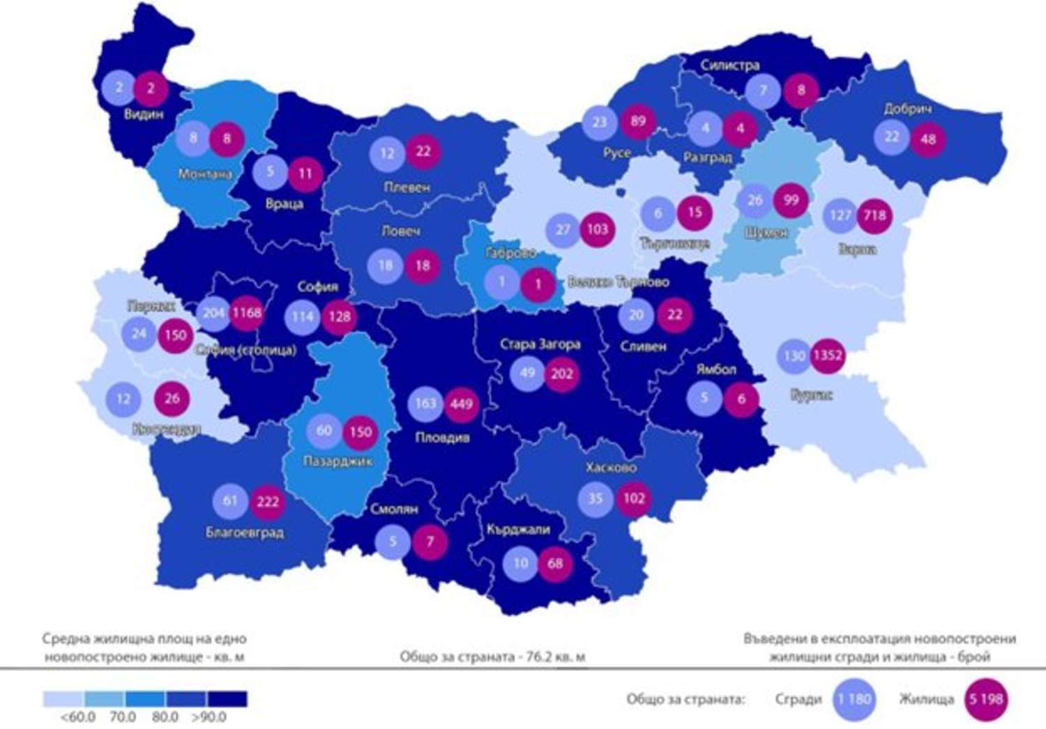 По данни на Националния статистически институт броят на въведените в експлоатация новопостроени жилища през второто тримесечие на 2023 г. са 5198, с над 27% повече от същото тримесечие на миналата година. Най-голям е броят на новите сгради и жилища в София, следвана от Пловдив, Бургас и Варна.