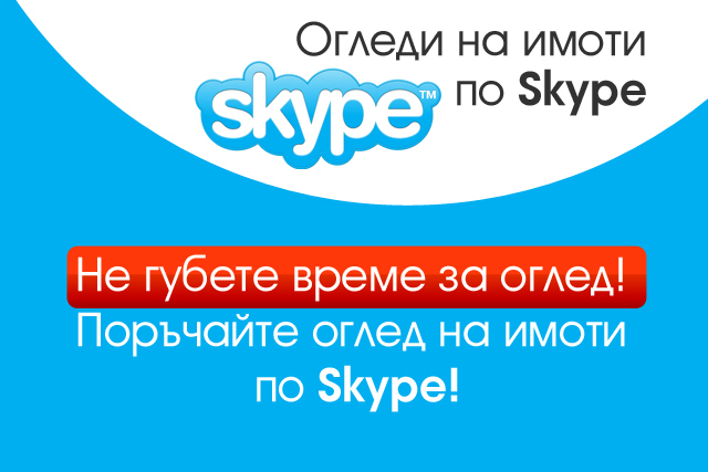 Забележка: Поради специфични нужди и технологични изисквания за организирането на огледи пo Skype, към момента предлагаме възможност за такъв тип огледи за селекция от над 700 имота. Нашата амбиция е постоянно да увеличаваме броя на имотите с възможност за оглед по Skype и съвсем скоро да можем да предложим тази услуга за всички наши имоти.