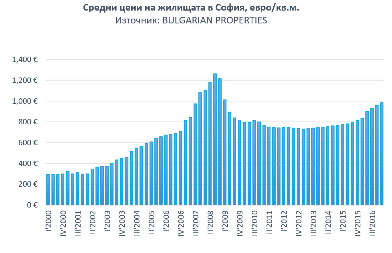 В началото на 2016 г. жилищата в София се продаваха средно за 835 евро на кв.м. Последва бързо нарастване до около 1000 евро на кв.м. година по-късно.