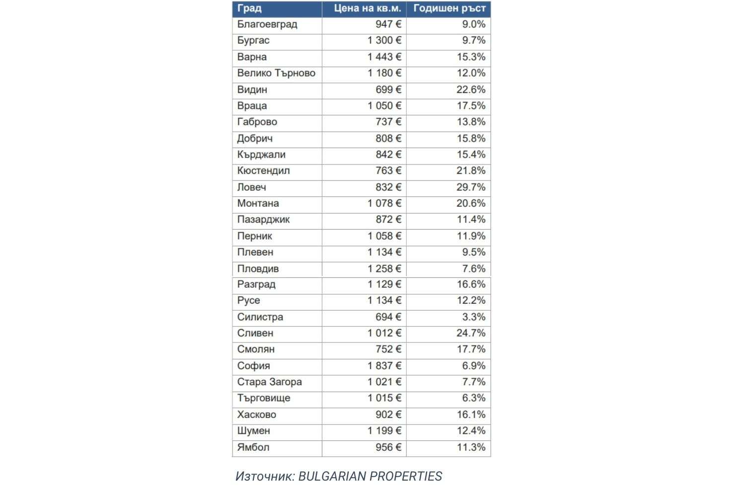 Най-голямо е поскъпването на квадратния метър в областните градове Видин, Кюстендил, Ловеч и Сливен, където за поредна година се отчита покачване от над 20%. Причината за това е най-вече догонващата тенденция за региони, в които развитието на пазара е изоставало преди това. Любопитно е, че София, Пловдив и Стара Загора отчитат ръстове от 6.9 до 7.7%, т.е. под средното за страната. В същото време търсенето в тези градове остава сред най-високите.