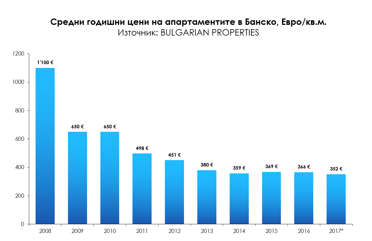 Средната цена на продадените апартаменти в Банско през третото тримесечие е 325 евро/кв.м. при 320 евро на кв.м. година по-рано. Средната цена за деветмесечието е 352 евро/кв.м. при 366 евро/кв.м. за цялата 2016 г.