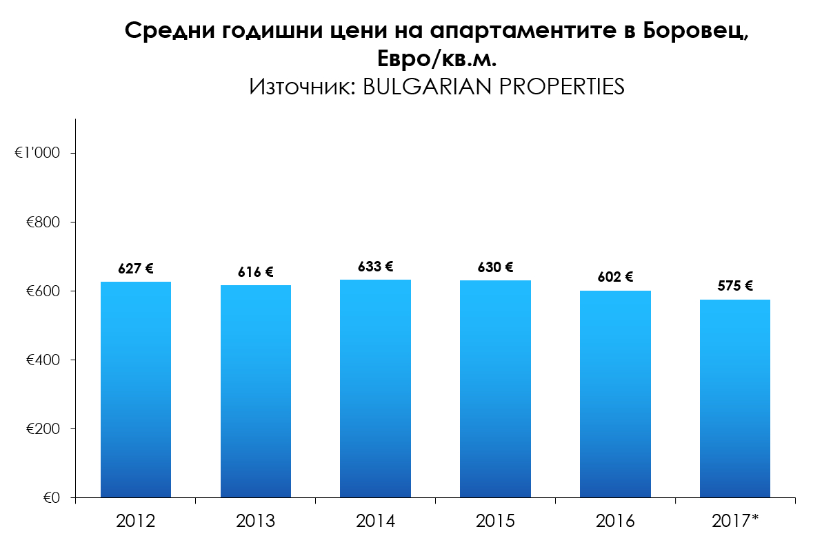 Боровец продължава да държи средна цена около 600 евро/кв.м. – 575 е измерената стойност за 3-тото тримесечие и също толкова за деветмесечието, като тенденцията е цените леко да нарастват, тъй като предлагането в Боровец вече е изключително ограничено и атрактивните имоти се продават бързо.